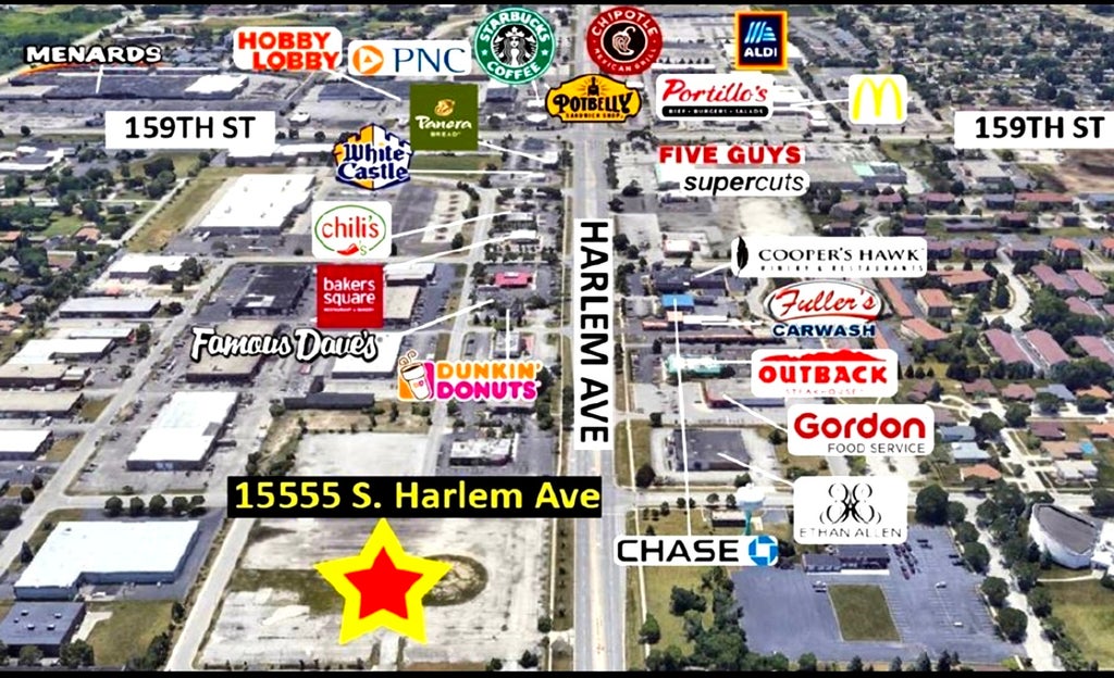 For Sale, ground lease, or Build to Suit Opportunity. The entire site is 5.3 acres. There are 2.58 acres on the outlot located at the northeast corner of Wheeler Dr.(15500 S) & Harlem Ave and fronting Harlem Ave. Preliminary plans depict three 37,000 sq ft outlots fronting Harlem Ave. and 2.53 acres on the east portion of the site. Nothing is finalized. Ownership will subdivide the site to accommodate the end user. An exceptional development opportunity for a variety of uses. Prime location with 583 feet of frontage along South Harlem Ave in Orland Park, IL. The site is currently zoned General Business District which allows for a variety of uses. This strategically positioned site features a 4-way signalized intersection, boasting high traffic counts and excellent visibility. Its placement within a major shopping and business district ensures maximum exposure while offering easy access from all directions. With a potential subdivision, this property presents a lucrative prospect for a new business or development looking to capitalize on Orland Park & Tinley Park's thriving business and shopping district along Harlem Ave and 159th St.