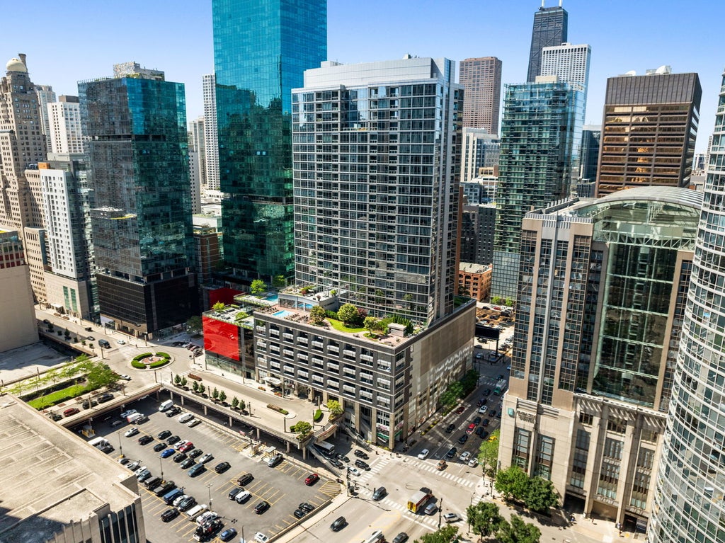 This exquisite one-bedroom, one-and-a-half-bath corner unit is situated in the prestigious Fairbanks of Cityfront, right in the vibrant heart of Streeterville. Perched on a high floor, the residence features a bright and spacious layout enhanced by floor-to-ceiling windows, offering breathtaking views of the city and access to a private balcony. The modern kitchen is equipped with recessed lighting, stainless steel appliances, granite countertops, a generous breakfast bar, and a built-in workstation. The expansive primary suite includes a walk-in closet and an ensuite bathroom with dual vanities and a shower featuring full body sprays. A convenient powder room near the entrance simplifies hosting guests. The unit also includes custom closets and shades for all windows, as well as in-unit laundry facilities. High-speed internet is provided as part of the assessment. The building boasts a comprehensive array of amenities, including an outdoor pool, separate cardio and weight rooms, a dog run, a theater, a business center, a bike room, multiple party rooms, 24-hour door staff, dry cleaning services, and a Whole Foods located on the plaza's main level. It is ideally located near The Riverwalk, the lakefront, and the shopping options along Michigan Avenue. The assessment covers high-speed internet and all utilities, excluding electricity, with rental parking available.