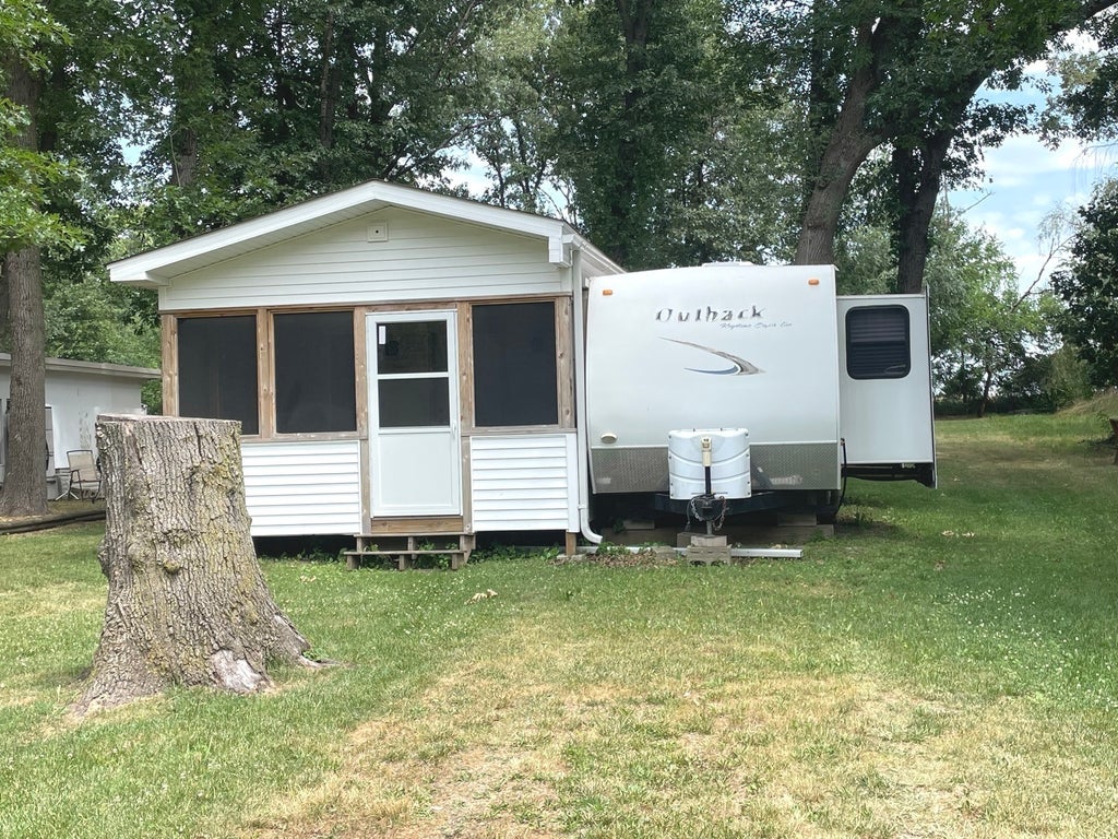 JUST REDUCED! Stunning Package! This unit sits on a deep flat sewered lot in Section 9. Features a 2010 Keystone Outback Travel Trailer, Screen Room, and Room Addition. Step into the screen room(2022) that is perfect for enjoying the breeze. Extra screen included in sale. Trailer has 1 bedroom, pullout couch, and fold down dinette for extra sleeping. Kitchen with cabinetry and stove, fridge, and microwave. Plenty of storage throughout. Come into the stunning room addition with extra space for sleeping guests with a trundle bed and couch. Space for playing games and entertaining guests around the table with chairs. Newer Jeld Wen Window's installed, 100amp electric in addition, new walls, and new fixtures. Portable honey well AC/Heat unit. At the back of the lot, you will find a spacious deck(2022) overlooking the lot and common ground. There is a shed with electricity, fire pit, and wooden chairs. Call today for a showing! Please note that Woodhaven Lakes is a gated recreational community and cannot be used as a primary residence or homestead. You must be accompanied by a broker to view any properties, YOU CANNOT ACCESS THE CAMPGROUND WITHOUT A PASS. Property owner pays the association fees.