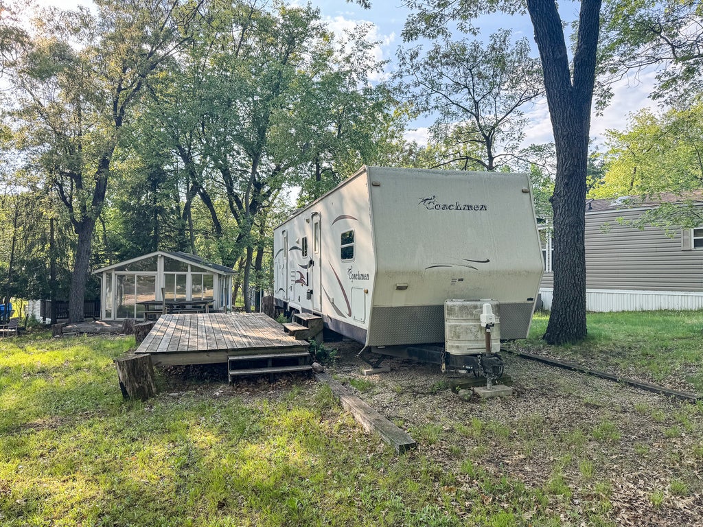 This unique corner lot listing package offers a convenient location to many amenities. Close to a walking trail leading to pool #1, the recreational complex, the pavilion and a comfort station! Included is a beautifully maintained 2006 Coach Craft travel trailer offers sleeping accommodations up to 8. A room addition adorned with glass windows-so lovely and UNIQUE! Also in place is a wood deck for entertaining/relaxing. Check out this one of a kind find before it's spoken for! Gated facility-must be accompanied by a Real Estate Broker to view listing. Property owner is responsible for yearly assessments. This is not a homestead property.