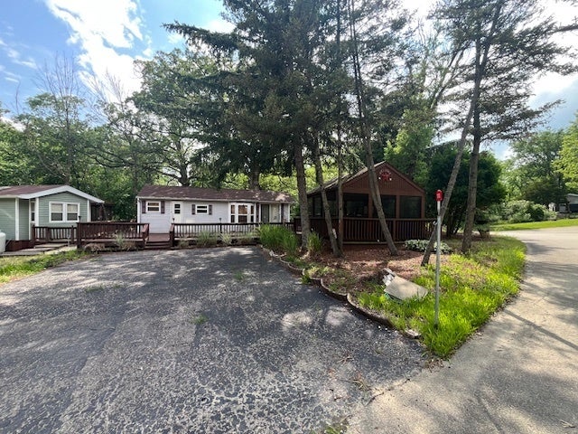 Welcome to Lot 1182 in the sought-after Woodsmoke Ranch community! This corner lot features a 1995 Canterbury Park Model with a roomy one-bedroom layout, complete with built-ins for convenient storage. The spacious kitchen offers ample counter and cabinet space, and flows into a comfortable living room and full bathroom. This turnkey property comes fully furnished, with all appliances included-plus a refrigerator that's only a year old. Beautiful wood laminate flooring was installed throughout in 2022. Step outside to enjoy the massive wraparound deck, perfect for relaxing or entertaining. There's also a detached screen room, paved driveway, and a storage shed for all your outdoor gear. The shingled roof was replaced in 2019 for added peace of mind. Whether you're looking for a peaceful getaway or seasonal retreat, this one is ready for you to enjoy! Category 5 lot with yearly dues of 2656.15 which include water, electric, garbage and park amenities. Woodsmoke Ranch amenities: 2 pools, 2 stocked fishing ponds, 3 pavilions, basketball courts, sand volleyball, gaga ball, bags, 2 playgrounds, RC car racetrack, baseball field, laundromat, convenience store, cafe, horse stables (for rent), adult lounge, Mygrain Saloon, events planned year long and so much more. RV campground community, cannot be a primary residence. Gated community; showings by appointment only. No access without an appointment.
