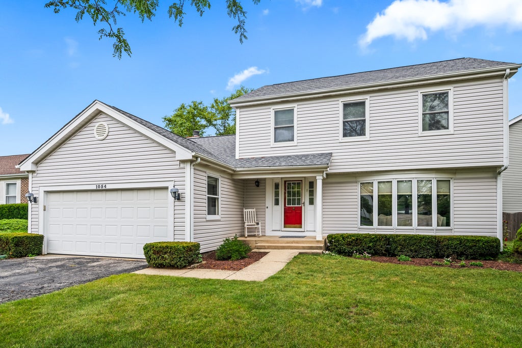 Welcome to this elegant colonial residence located at 1054 Shady Tree Lane in Wheeling. This charming home spans 2,404 square feet and is nestled on a generous 6,534-square-foot lot in the highly sought-after Ridgefield subdivision of the premier neighborhoods served by award-winning District 23 schools. Upon entering, you are greeted by the warmth of hardwood floors that flow seamlessly throughout the main living areas. The living room offers a classic fireplace and a skylight that fills the space with natural light, creating a cozy yet inviting ambiance. The home features three well-appointed bedrooms, including a spacious primary suite with a remodeled en-suite bathroom (2024), a large walk-in closet, and enough space to accommodate all your needs. An additional full bathroom and a remodeled half bathroom (2023) serve the rest of the home. A screened-in sunroom overlooks the lush, green backyard and provides a peaceful retreat that feels like you're surrounded by nature. Thanks to the full-length windows, it's a perfect space to enjoy even as the weather cools. The quiet neighborhood and tranquil street only add to the serenity. The partial basement offers ample storage, along with a bright finished area ideal for a home office, playroom, or additional bedroom. Recent updates include a new water heater (2023), roof (2019), exterior siding (2020), refrigerator (2024), dishwasher (2025), sump pump with backup and battery (2024), and a radon mitigation system installed within the last five years. Located just minutes from the Wheeling Town Center, Metra, shopping, and dining, this beautifully maintained home offers timeless style, everyday functionality, and modern comfort in a premier location.