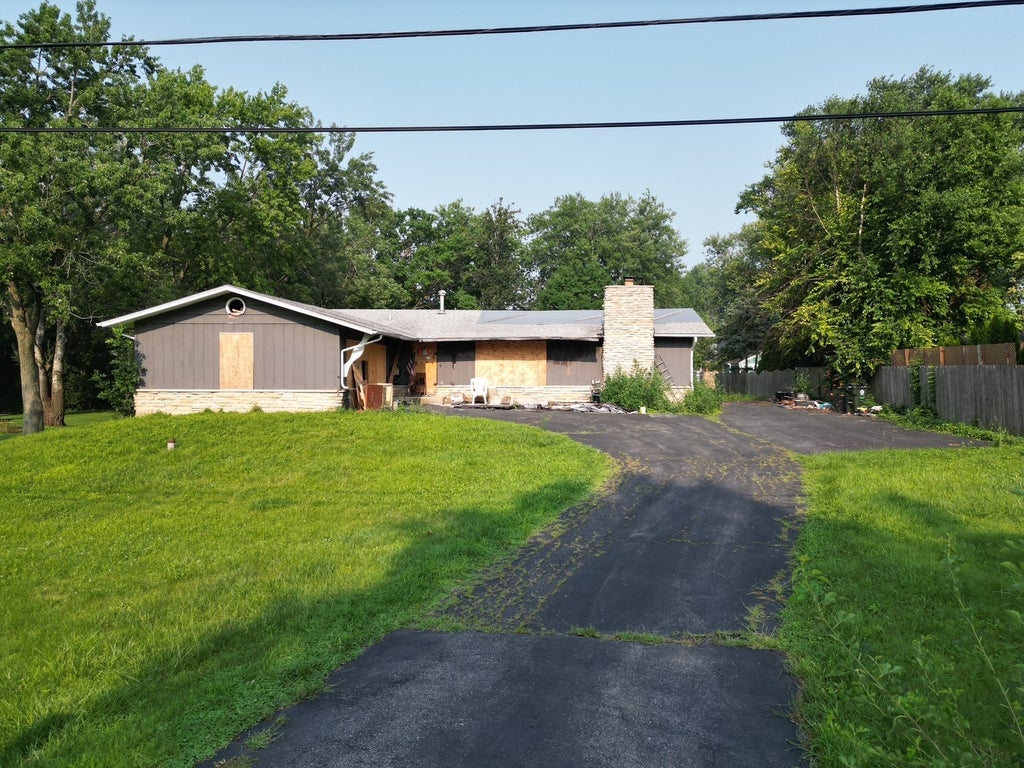 House had a fire and is considered to be a teardown. House is NOT safe, please do NOT attempt to go inside. Basement is full concrete with approximately 1,400 sq ft footprint. Utilities are to house (electric, water, sewer and gas - Property also has a well that needs new well pump). Wonderful opportunity to get into the prestigious Bruce lake Neighborhood. 1/2 acre lot in unincorporated DG.