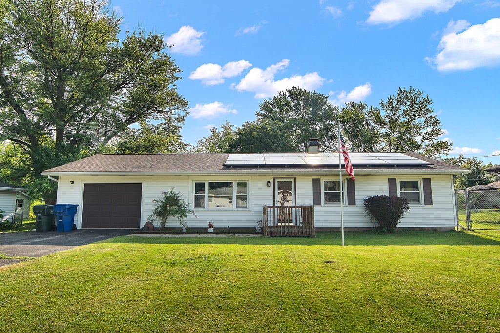 Longtime owners offer this neat and clean flat ranch on large fenced yard! Main floor features large living room. Formal dining area plus kitchen all appliances included (new stove in '21!) 3 Nicely sized bedrooms with one full bath with updated vanity! Attached 1.5 car garage! Maintenance free vinyl exterior plus huge patio overlooking large full fenced in yard with 2 sheds! Great central location--close to everything! City sewer/water! Most of the heavy lifting has been done--just make some cosmetic upgrades! New HWH in '18! New furnace/AC in '13! Vinyl replacement windows through out! Front portion of the roof replaced in '23! Back portion of the roof replaced in @ '08! This home comes equipped with solar panels to keep your electric bill in check! Don't miss this great investment opportunity...ranches are hard to find!!