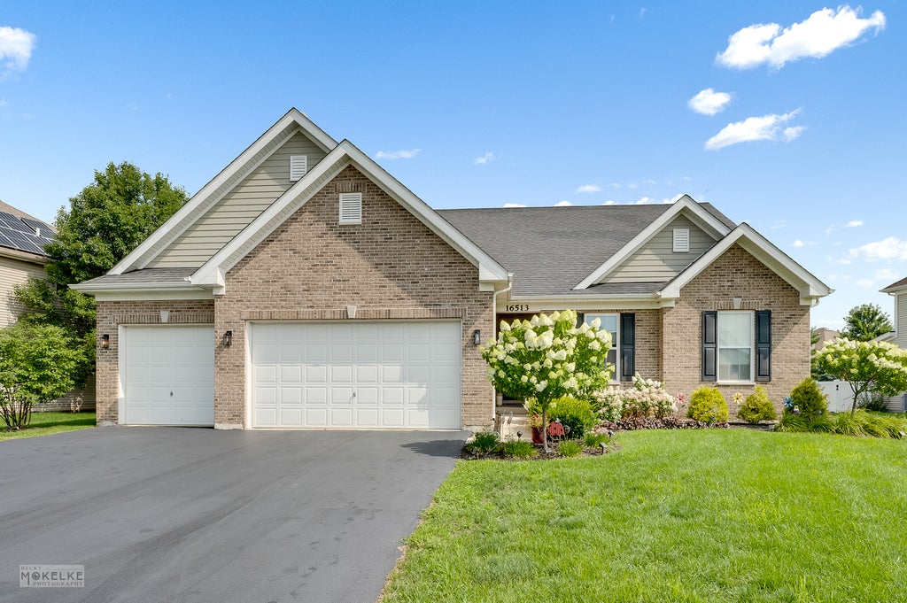 Welcome to 16513 Mueller Circle - a beautifully maintained custom-built ranch offering comfort, style, and functionality in every detail. This 3-bedroom, 2-bathroom home with a full basement is sure to impress from the moment you walk in. Step inside and be greeted by a spacious, open floor plan featuring hardwood flooring and nine-foot ceilings throughout the main level. The entire home is freshly painted including the ceilings and walls. With enhanced updated lighting and custom blinds, creating a bright and modern atmosphere. The family room provides the perfect gathering space for entertaining or relaxing, while the dining area is filled with natural light and includes a sliding glass door that leads to the incredible backyard. The updated kitchen is a chef's dream with stainless steel appliances ~ refrigerator (2023) granite countertops, stylish backsplash, and added recessed lighting. Just off the kitchen, you'll find a convenient laundry room complete with washer and dryer (2018). Retreat to the spacious primary suite, featuring a vaulted ceiling, walk-in closet, and abundant natural light. The updated en-suite bathroom boasts barn door, modern tile, a fully tiled shower with new glass door, updated vanity, mirror, and lighting. The secondary bedrooms are generously sized with ample closet space and share another beautifully updated full bathroom. Step outside to enjoy the large, fenced-in backyard with a stamped concrete patio - ideal for outdoor entertaining, peaceful mornings, or evening relaxation. Entire landscaping was added and updated in the past couple of years. The 3-car garage is a true benefit - fully insulated, drywalled, heated, and equipped with built-in organizers, bike racks, and shelving included. The full basement offers endless potential with rough-in plumbing already in place, ready for your personal touches. Water heater re-circulating pump (2024) hot water on demand. Don't miss this move-in ready gem offering modern updates, thoughtful design, and exceptional space both inside and out. Schedule your private showing today!