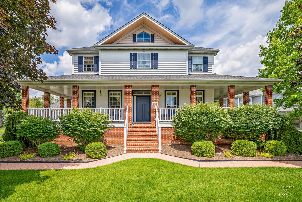 Welcome to a one-of-a-kind custom built home in the Chalet Hills Golf Course community, where timeless elegance and modern comfort come together on a beautifully landscaped corner lot. This 4-bedroom, 2.1-bath home immediately draws you in with its charming wraparound porch creating inviting spaces to enjoy your morning coffee, an afternoon breeze and beautiful sunsets. Inside, Brazilian cherry hardwood floors and a bright, thoughtfully designed layout create a warm and functional flow. The heart of the home is a vibrant kitchen that blends retro charm with modern luxury, offering crisp white cabinetry, quartz countertops, island seating, cooktop, double oven, walk-in pantry, and a sunny eating area. The formal living and dining rooms are ideal for entertaining, with buffet cabinetry and light fixtures that add style throughout. Floor to ceiling windows fill the family room with natural light overlooking the backyard and a wood burning brick fireplace with gas-start centers the space. A main-level office with a closet and built-in bookcases with reading nook, offers flexibility as a fifth bedroom. Upstairs, hardwood floors continue throughout. The primary suite includes a private sitting room, walk-in closet, and updated spa-like bath with a freestanding tub, designer shower, and dual vanities. Three additional bedrooms share the hall bath with two vanities, a soaking tub, and separate shower. The English basement has rough-in plumbing, and endless potential for future living space. An attic bonus room-easily accessed by a closet staircase-is also ready to be finished into a playroom, or guest space. Built with quality, the home features dual-zoned HVAC, Pella casement windows, 2"x 6" construction, kiln-dried cedar siding, brick pillars, a new well pump (2020), and pressure tank (2024). The mudroom provides an easy transition space off the garage. Outdoor living shines with a stamped concrete patio, elevated deck, and blooming perennial gardens creating a peaceful retreat. Spotlessly clean and lovingly maintained, this is a rare opportunity to own a beautiful home in one of the area's most sought-after communities. This home is a must-see!