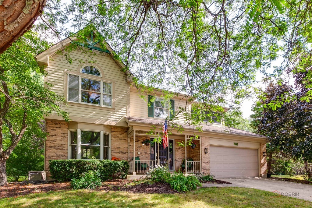 CUL-DE-SAC LOT IN INTERLAKEN MEADOWS! From the moment you arrive, this beautifully maintained home captivates with its inviting front porch-perfect for morning coffee or greeting guests. Inside, a warm and welcoming foyer, highlighted by impeccably kept hardwood floors that flow throughout the main level, opens into the sun-filled sunken living room. A bay window fills the space with natural light, creating a serene and airy retreat for relaxing or gathering with friends. The adjoining dining room makes entertaining effortless, while the spacious eat-in kitchen serves as the heart of the home. Featuring beautiful granite countertops, a stylish tile backsplash, abundant cabinetry, a closet pantry, and a peninsula with breakfast bar seating, it accommodates everything from casual breakfasts to gourmet meals. The sunny eating area, with sliders to the backyard, seamlessly connects to the deck-complete with built-in seating-and just beyond, a patio with a pergola offers the perfect setting for summer cookouts and outdoor gatherings. A thoughtfully placed half bath completes the main level. Upstairs, the expansive primary suite is a private retreat, boasting a generous walk-in closet and a luxurious bath with a soaking tub, separate subway-tiled shower, and dual-sink vanity-a spa-like escape at home. Three additional bedrooms and a second full bath provide comfort, privacy, and ample closet space for family or guests. The finished basement adds versatility with a large rec room, media/game area featuring a built-in bookcase, or a cozy lounge space-perfect for whatever your lifestyle demands. A convenient laundry area with a chute and plenty of storage completes the lower level. Two-car attached garage and an outdoor storage shed enhance functionality and organization. Located just minutes from top-rated schools, Independence Grove, and downtown's best offerings-from the summer farmers market to fabulous restaurants and charming boutique shops-this home effortlessly combines style, comfort, and an unbeatable location.