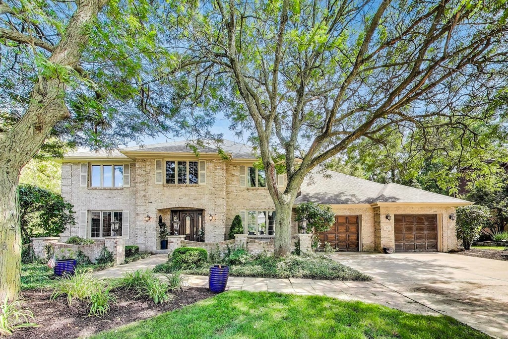 Tucked away on a peaceful cul-de-sac and set on a charming half-acre lot, this beautiful brick two-story home offers privacy, space, and convenience-just minutes from shopping and dining. Enjoy stunning rear views from the upper deck or lower patio, with lush landscaping and a serene setting that includes a quaint bridge over a creek leading to Creekside Park. Inside, you'll find four generously sized bedrooms with brand-new carpeting, fresh neutral paint throughout, and gorgeous new Brazilian hardwood floors. The spacious family room features a vaulted ceiling and a dramatic two-story stone fireplace. Work from home in the main-floor office just off the family room. The walk-out basement offers incredible versatility with a second kitchen, additional dining area, and another cozy stone fireplace-ideal for guests, gatherings, or multi-generational living. Other standout features include detailed millwork, new lighting, abundant storage, and a 3-car garage. Major updates like the roof, HVAC, and water heater have all been completed since 2012. Located in the highly sought-after Hinsdale Central High School District, this home blends classic charm with modern updates in an unbeatable location.