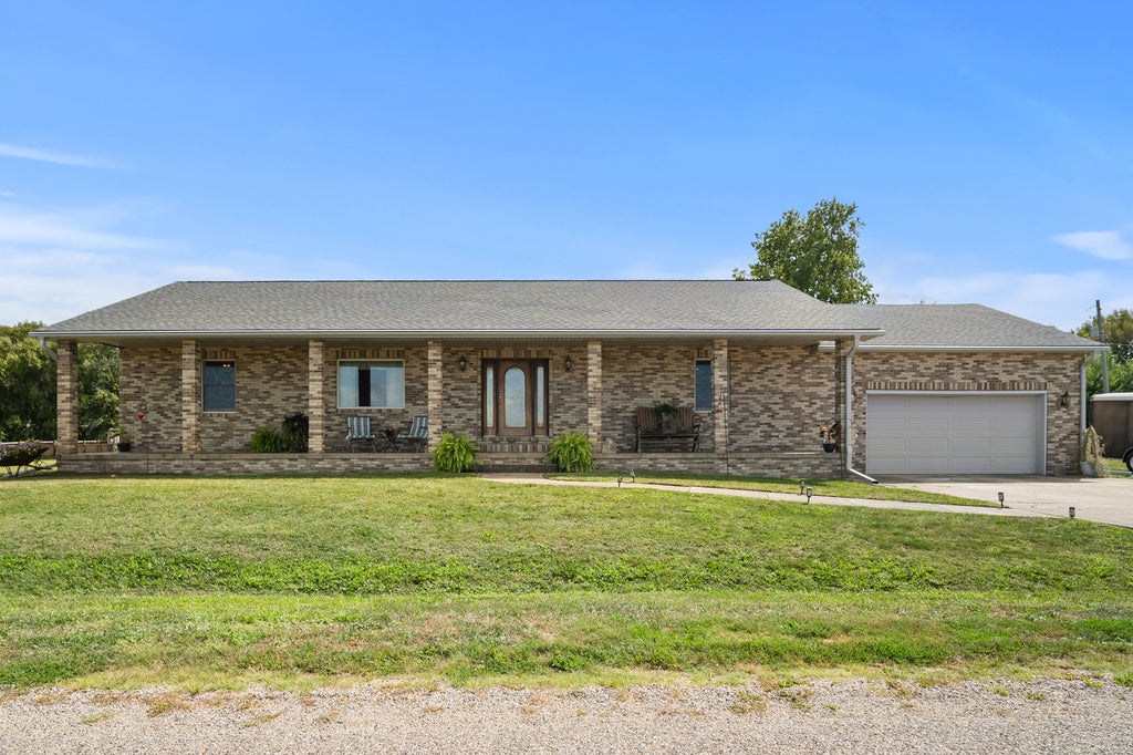 All-Brick Ranch on a Private Lot with Open-Concept Living! Welcome home to this beautifully maintained all-brick ranch, set on a peaceful and private lot. A full-length 8x60 covered front porch with stamped concrete welcomes you inside, where the spacious open living room greets you with gleaming hardwood floors and abundant natural light. The dining area flows seamlessly into a classic kitchen featuring oak cabinetry, Corian countertops, a convenient peninsula, and a complete appliance package-perfect for both everyday living and entertaining. The primary suite offers a comfortable retreat with a walk-in closet and a private bath, recently updated with a new walk-in shower, soaking tub, and ceramic tile floors. Two additional bedrooms, each with lighted ceiling fans, share a full hall bath. Original woodwork and Anderson windows add timeless quality throughout the home. Main floor conveniences include a laundry room and access to the expansive full basement with soaring 9' ceilings-ready for your finishing touch. Enjoy outdoor living with a concrete patio and the efficiency of geothermal heating, a dewatering system, and solar panels. All electric household with the monthly bill less than $20. The oversized 2-car garage (24x30) includes double doors in front and a handy single door at the back for easy access. 3 addtl lots to the East of the home (to the brush line) are included. This home combines comfort, quality, and energy efficiency in a serene setting-don't miss the chance to make it yours!