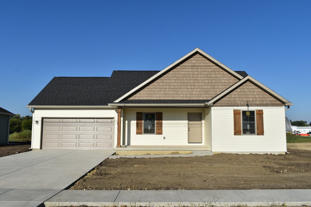 Quality built by local builder with better than average materials! Located in town, but with country views offering covered front porch facing east perfect morning coffee. Super open floor plan everyone wants, solid surface kitchen countertops & quality soft close cabinets with dovetail drawers, master suite with walk-in shower, main floor laundry, full basement w/egress window & rough-in for bath whenever you're ready to finish the basement! Private patio in back for grilling & relaxing. Seller will seed lawn this fall.