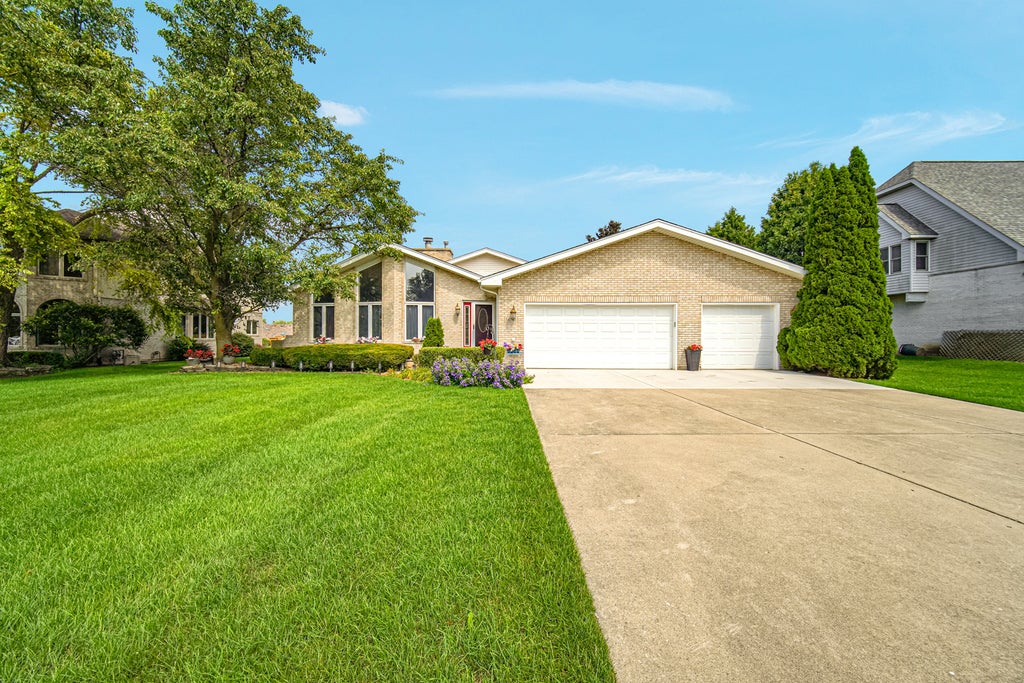 Welcome to this one-owner, updated all brick custom-built ranch with a fully finished basement, located in the peaceful and desirable Stadler Ridge Estates. Thoughtfully designed by its original owners, this sprawling ranch offers both elegance and functionality. As you step inside, you'll immediately notice the abundance of natural light streaming through vaulted and cathedral ceilings enhanced by skylights. A striking floor-to-ceiling brick fireplace elegantly separates the living room from the great room, creating warmth and charm. To your right, you'll find a dream kitchen featuring custom maple cabinetry, solid oak doors, stainless steel appliances, granite countertops, and an expansive island with ample workspace-perfect for cooking and entertaining. Just beyond the kitchen is a spacious dining area or sunroom, which opens onto a beautiful, maintenance-free deck ideal for relaxing or hosting guests. All bedrooms are generously sized, with the primary suite offering a luxurious retreat. It includes a large walk-in closet, a spa-like bathroom with a jetted jacuzzi tub, and a separate shower. The fully finished basement is impressively spacious, featuring a cozy second fireplace, a large family room, a separate bedroom, a full bathroom, a game room, and a functional work area. It offers both a staircase from the main living area and a private entry from the pristine 3-car garage. Step outside to your own serene retreat-beautifully landscaped grounds, vibrant flowers, and a small babbling pond create a peaceful backyard oasis. This meticulously cared-for home offers comfort, space, and tranquility. Don't miss the opportunity to experience it in person-it's truly a home that won't disappoint. Easy access to expressways,shopping and dining.Walking distance to libraryand heritage park. Very easily can be related living with a private entrance from garage.