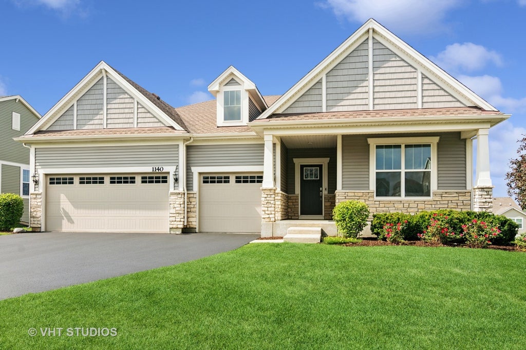 Welcome to 1140 River Birch Boulevard! Finally ... the ranch home you have been searching for! You will love the ability to move right in to this sought after Matisse G Elevation floor plan featuring an expanded lower level walkout, and feel like you can be settled in for the Holidays in your beautiful new home! Built by Lennar in 2020, this property has been beautifully maintained and is nestled on one of the premium lots in the desirable Woodlore Estates neighborhood. This residence offers exceptional curb appeal with stone and vinyl siding, a freshly sealed driveway, professional landscaping, a charming covered front porch, large 3-car garage, and a spacious rear wood deck with pretty views of the neighborhood green spaces, trees and park. Inside, you'll find approximately 4,800 square feet on 2 levels of open-concept living space featuring upgraded 5-inch hardwood wide plank floors, recessed lighting, designer lighting and 9-foot ceilings throughout the main living areas. The kitchen boasts GE stainless steel appliances, large center island with breakfast bar seating, quartz countertops, a walk-in pantry, and ample room for your breakfast table and direct access to your covered deck. The family room is a cozy space with a gas starter fireplace equipped with a recessed outlet and tv jack, and opens to the dining area is ideal for entertaining family and friends. The sun-drenched primary suite features a huge walk-in closet and a spa-like bathroom with a double quartz vanity, ceramic tile floors, and a deluxe walk-in shower. Additional bedrooms include walk-in closets and well-appointed baths. The laundry room is equipped with a laundry tub and hookup for your full sized washer/dryer. The unfinished expanded walkout basement offers high ceilings, large windows, sliding door to rear patio, abundant storage and amazing future finishing potential. Mechanicals are only 5 years old and include a Carrier furnace and A/C, Air Exchanger, Bradford water heater with hydrogen defender, Sump Pump, and Flo-Master central vacuum system. This home is close in proximity to Three Oaks Recreation Area, Downtown Crystal Lake, fabulous shopping, dining, Metra access and sought after Prairie Ridge High School!