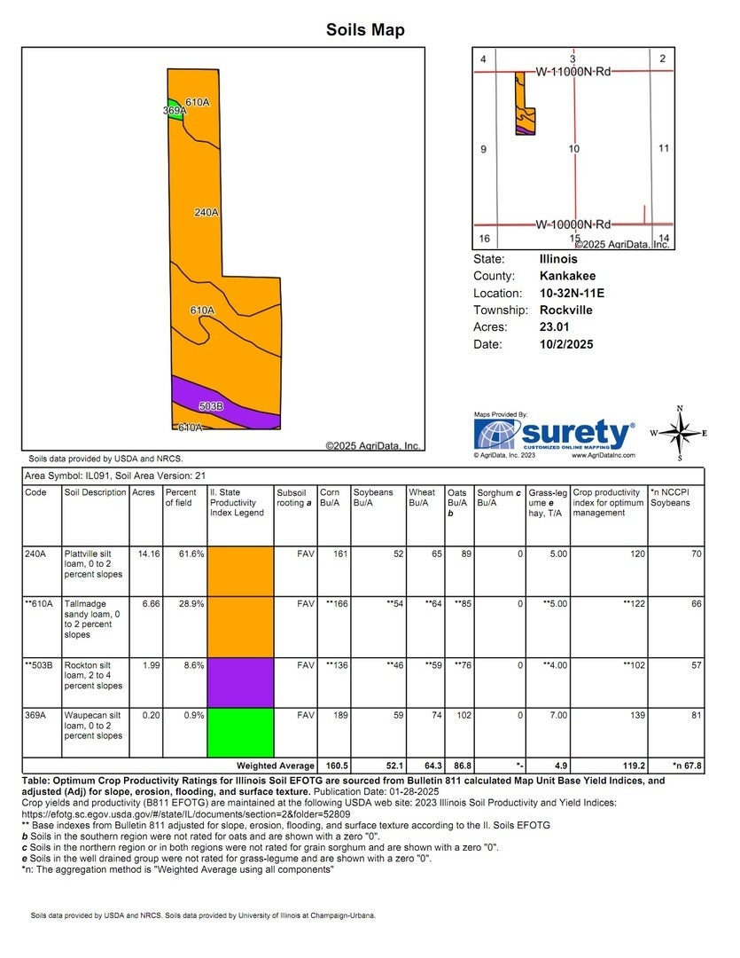 Excellent 25 +/- acres in Rockville Township with a good tenant and PI of 119.2 mainly Platville and Talmadge soils Farm lays very nicely